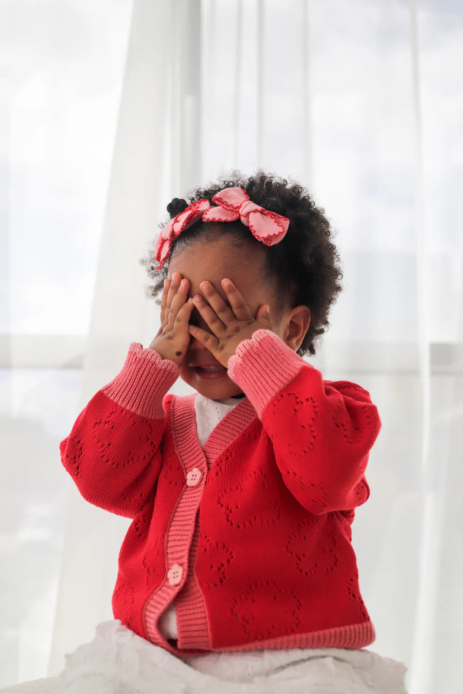 Thin knit cardigan in our Scarlet colour featuring a flower pointelle detail, contrasting scallop cuffs and waistband and flower buttons down the centre. Mix and match with items from our Christmas Collection.