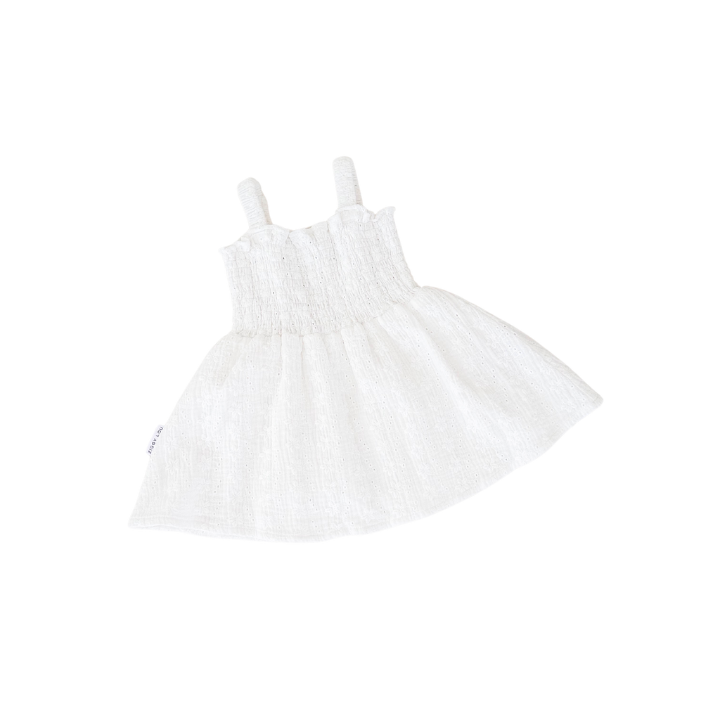 Cotton dress in our Laurel broderie anglaise fabric. Shirred bodice with adjustable button hole straps. Mix and match with items from our Christmas Collection.