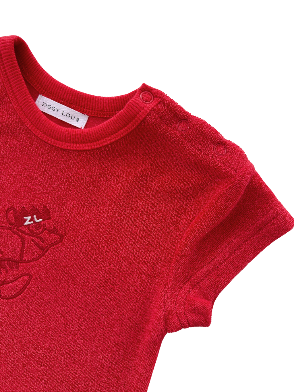 Terry towelling playsuit featuring our Shawn the Prawn design on the front. Functional press snaps at crotch for easy nappy changes and press snaps at shoulders for easy on/off.